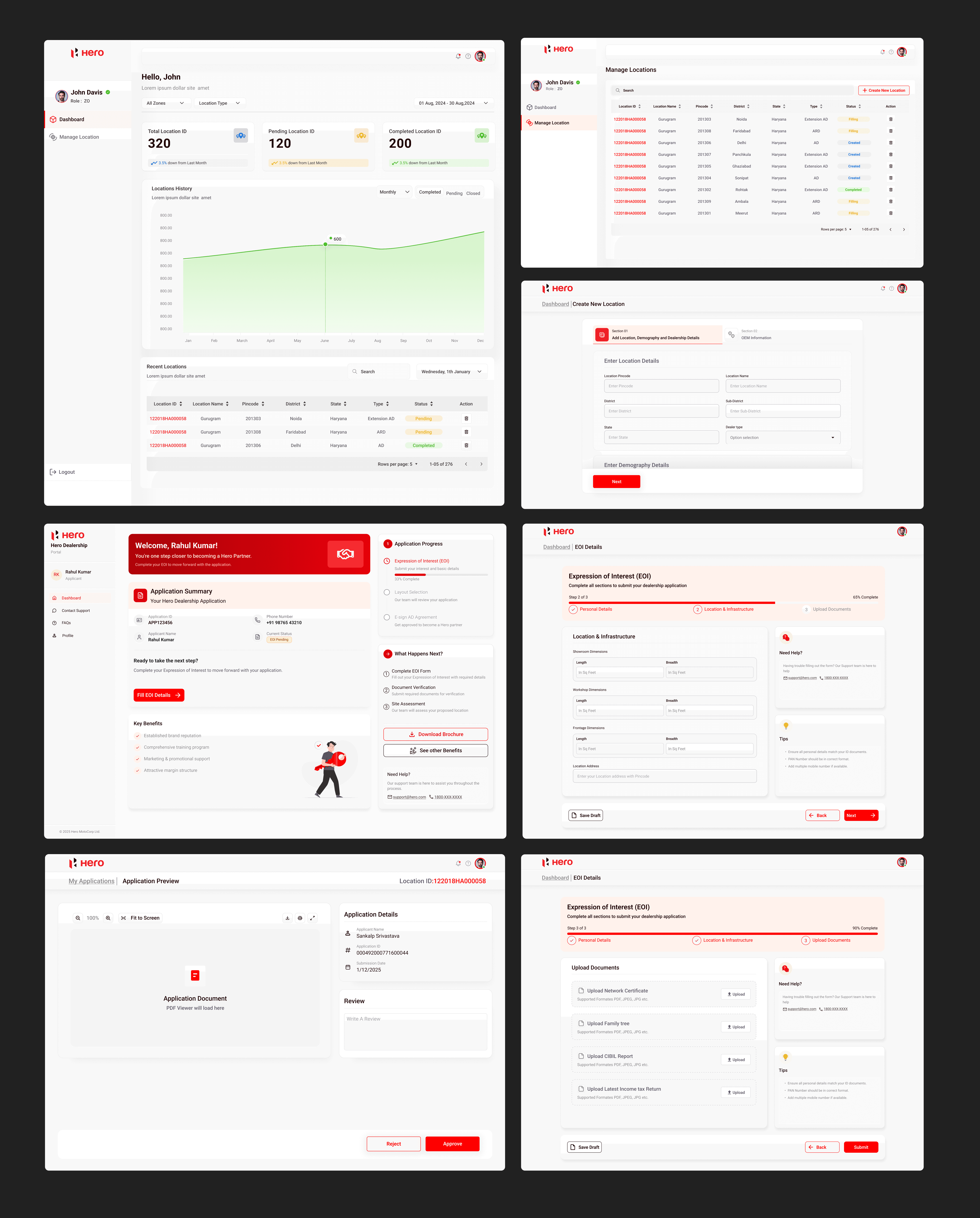 This project was for Hero MotoCorp to design a dealership onboarding system. The workflow had multiple levels: Zonal Office (ZO) created a location ID, Touchpoint Office (TO) generated multiple application IDs linked to that location, Area Office (AO/ASM) approved or rejected applications, and finally, the Customer Account Department (CAD) verified details before notifying the customer to log in and complete their dealership registration.